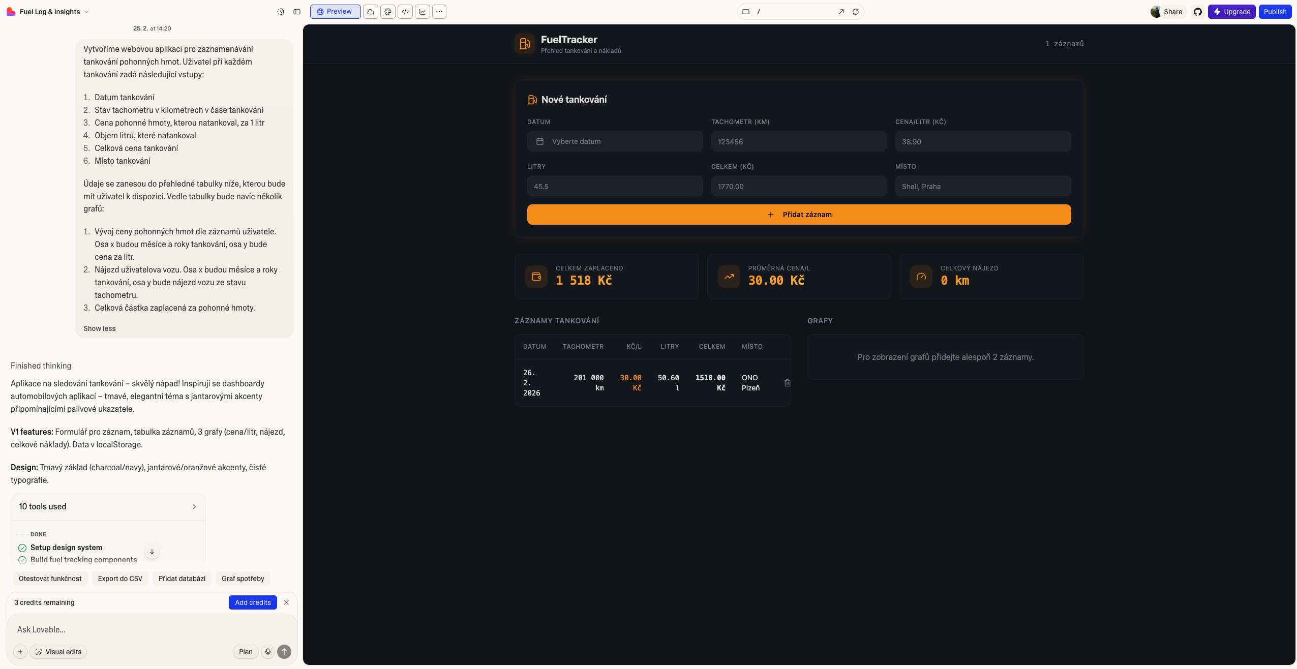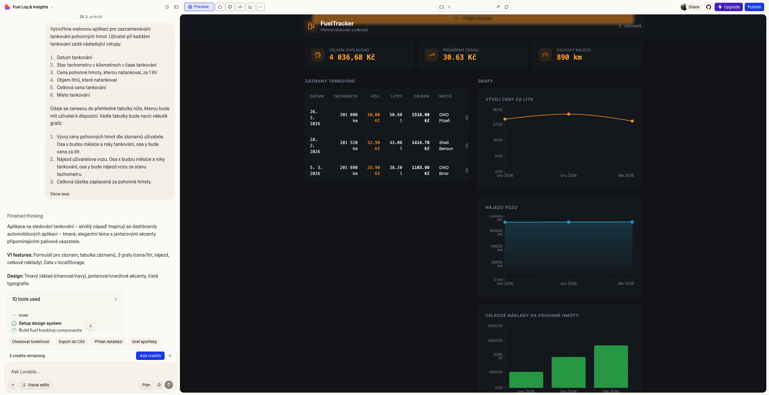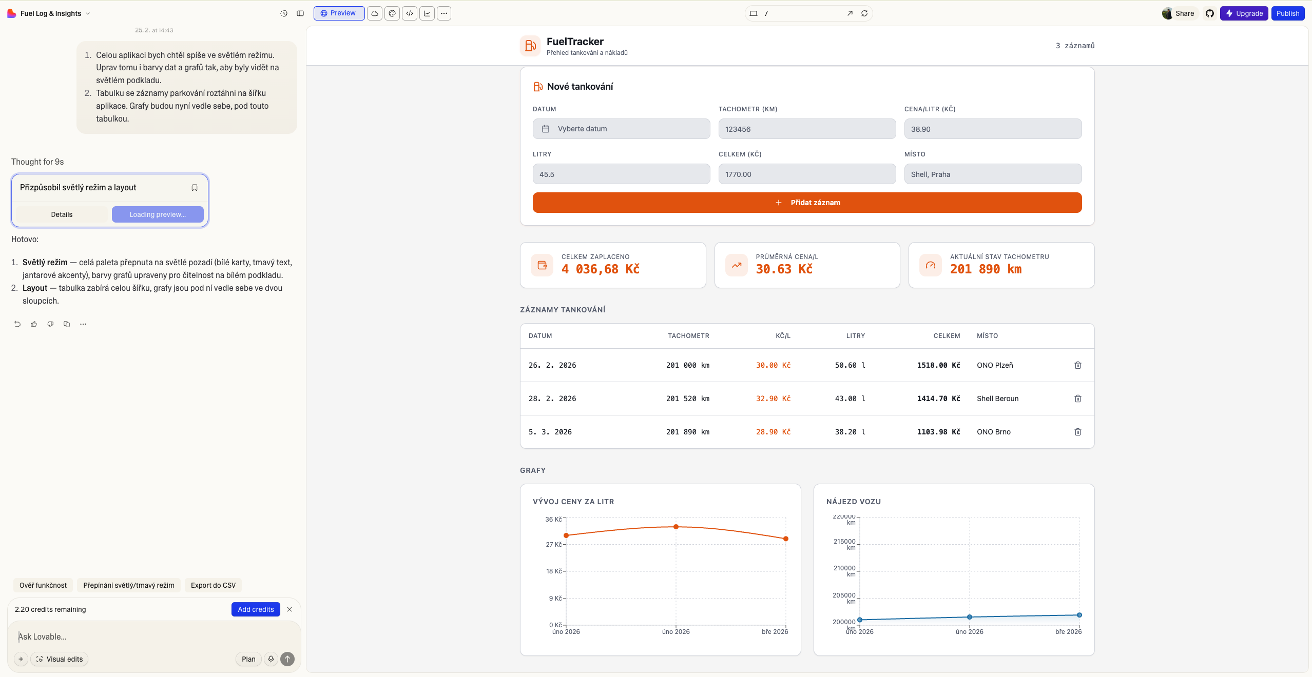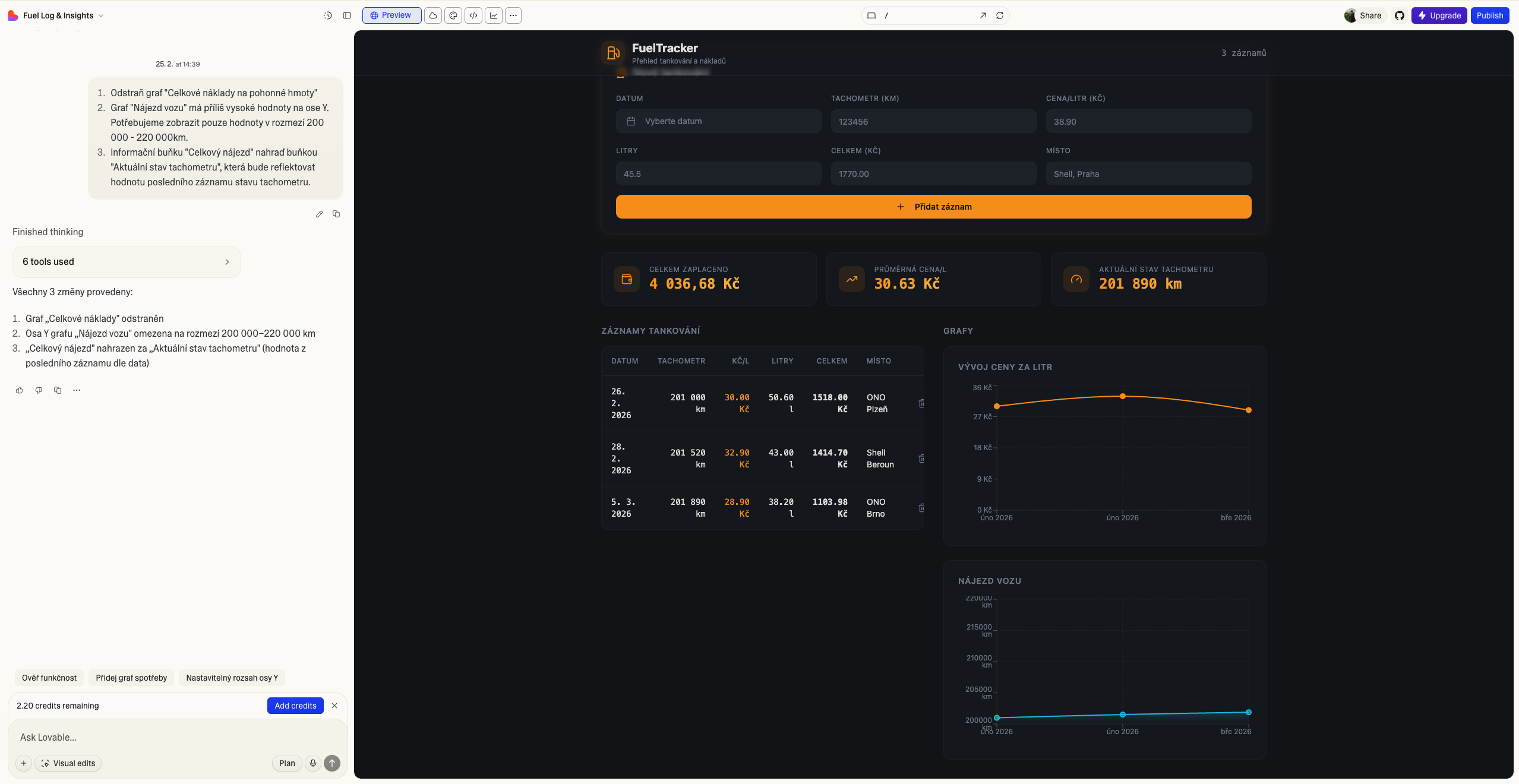 Po přidání více záznamů si začínáme všímat prvních chyb. Metrika celkového nájezdu nedává příliš smysl a mohla by ukazovat spíše současný stav tachometru. Pro zobrazení grafů je nutné scrollovat níže, a aplikace tak není příliš praktická. Graf celkových nákladů sice znázorňuje, že celkový náklad je vyšší a vyšší, pro statistický součet nám však stačí buňka „celkem zaplaceno“, kterou si vytvořil sám Lovable. Hodnoty v grafu nájezdu vozu nejsou téměř viditelné, kvůli příliš vysokému rozptylu. Nyní je tak čas na provedení změn. Tyto změny neřešíme v kódu, ale psaním do chatu, tak jak to známe z LLM. A právě tyto změny stojí kredity.