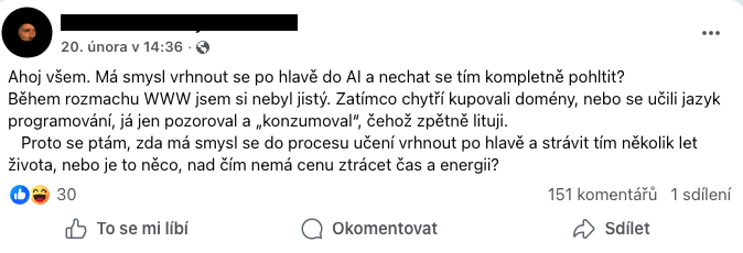Marketingový pojem FOMO je znám zejména mladší generaci. Jedná se o zkratku z anglického fear of missing out = tedy strach, že vám něco utíká. Běžně se projevuje jako pocit, že ostatní dělají něco, co byste měli dělat také, že jsou ostatní napřed, nebo že jste zkrátka zaspali dobu. V nákupním procesu se může jednat o situaci, kdy máte strach, že se vyprodá výrobek, o který máte zájem. Někteří tvůrci momentálně řeší vibecoding a AI témata opravdu intenzivně. Ve feedech se neustále objevují příspěvky o SAAS projektech postavených v podstatě za víkend. Každý technologický influencer už má minimálně 3 agenty, kteří běží 24/7 na počítačích zvlášť k tomu určených (nejčastěji se zmiňuje stroj Mac mini M4 ). Pokud sociální sítě konzumujete denně, je velmi snadné podlehnout pocitu, že kdo tyto věci nedělá, tomu ujíždí vlak.